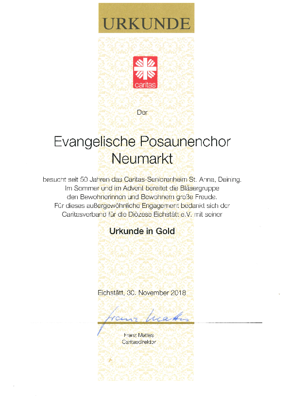 Während des Konzerts im Caritas-Seniorenheim St. Anna, Deining überreichte Einrichtungsleiter Norbert Bittner der Leiterin des Posaunenchors Neumarkt i.d.OPf., Beatrice Höhn, eine "Urkunde in Gold", ausgestellt von Caritasdirektor Franz Mattes.