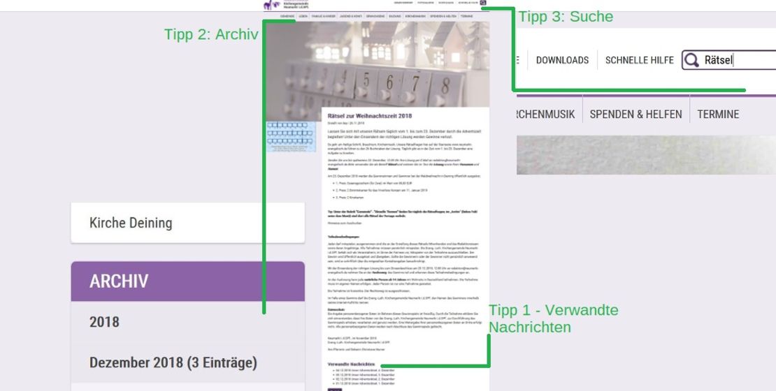 Ein Mausklick unter "Gemeinde" auf "Aktuelle Themen" öffnet eine Box "Archiv" auf der linken Seitenleiste. Mit dem Link "Dezember (.. Einträge)" werden im Textfenster ebenfalls die Rätselfragen gelistet.