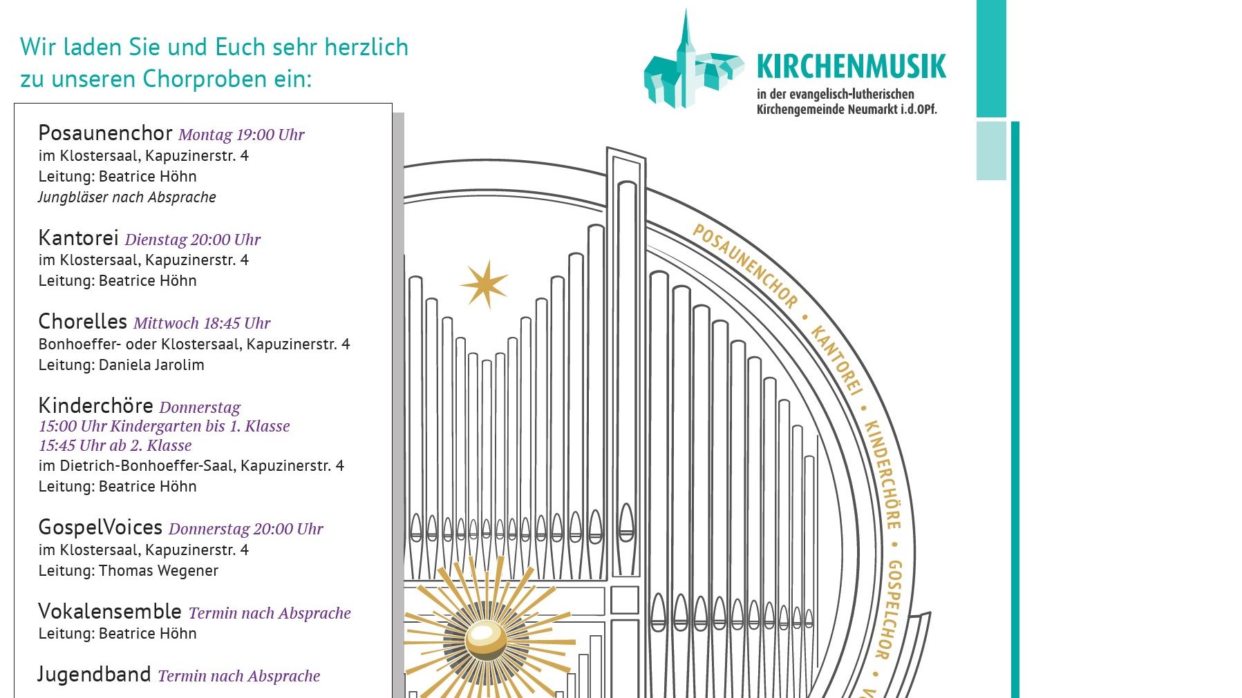 Konzerte und Gottesdienste sowohl mit unseren eigenen Chören als auch mit Gastmusikern, Musik für Kinder, Veranstaltungen zum Mitsingen, Oratorienkonzert der Kantorei, Turmblasen des Posaunenchors und noch Einiges mehr.
