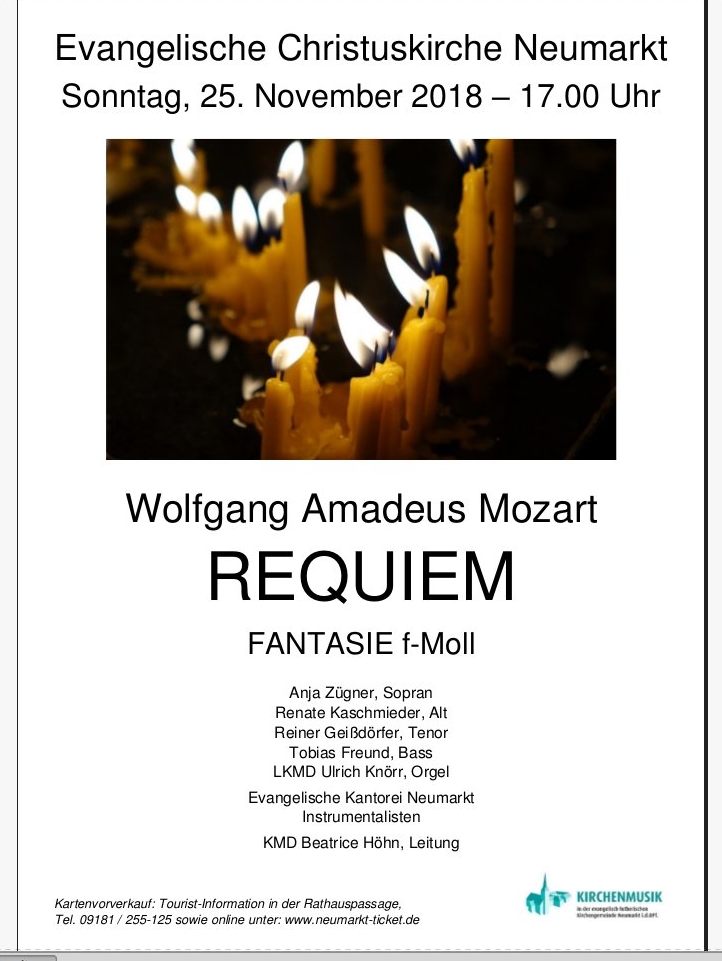 Am Sonntag, 25. November 2018, dem Ewigkeitssonntag, führt unsere Kantorei um 17 Uhr in der Christuskirche das „Requiem“ von Wolfgang Amadeus Mozart auf, das sowohl beim Publikum als auch bei Solisten, Chorsängern und Orchestermusikern zu den beliebtesten Oratorien zählt.