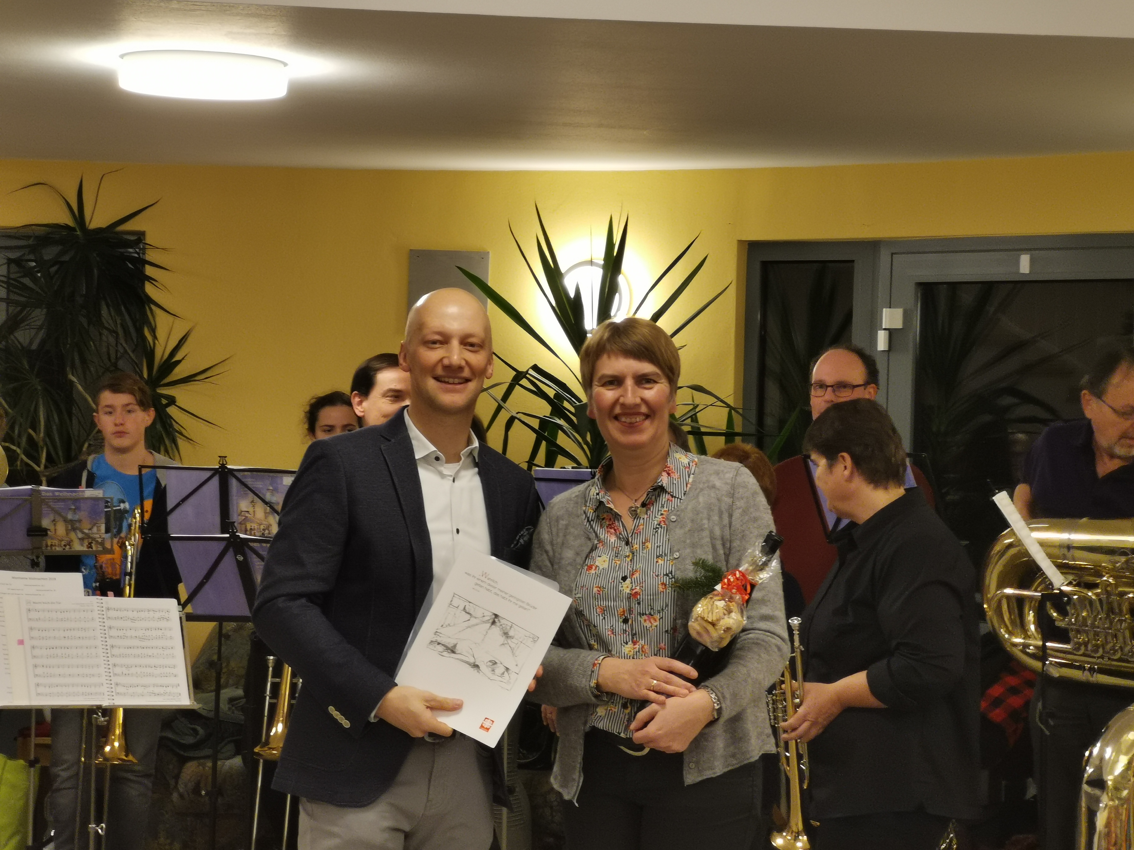 Einrichtungsleiter Norbert Bittner überreicht die Urkunde für 50 Jahre Konzerte im Seniorenheim Deining