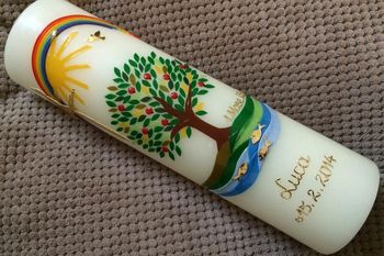 Die Kerze kann im Taufgottesdienst und am Tauftag oder Geburtstag zur Erinnerung an die Taufe angezündet werden. Es ist eine schöne Möglichkeit, die Taufkerze mit Taufsymbolen, Namen und Taufdatum zu gestalten.